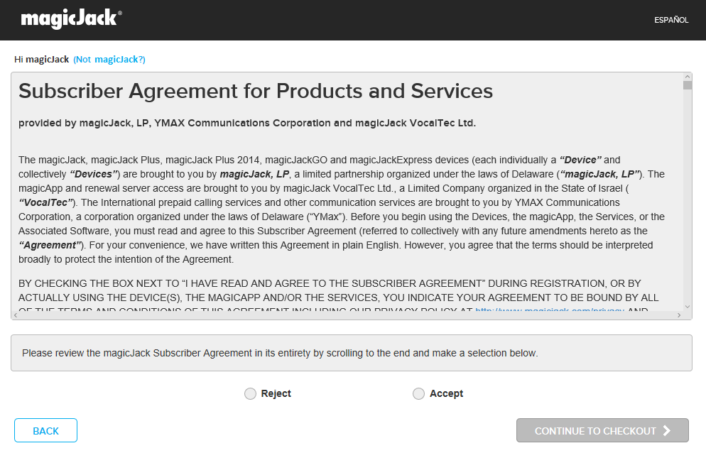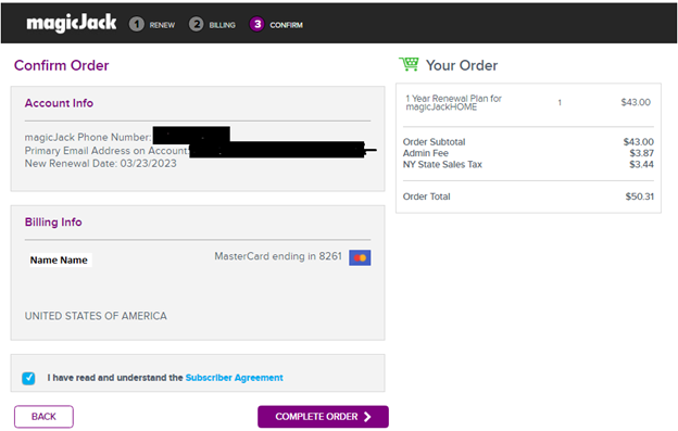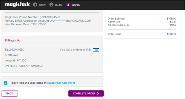 - Review the magicJack Subscriber Agreement, select the checkbox then click COMPLETE ORDER