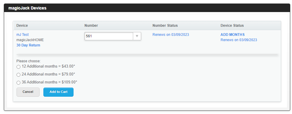 - Underneath the magicJack Devices section of the page, locate the Number Status column. Click the Add a Year link associated with your expired phone number. Your 1 year number renewal will automatically be added to your cart.