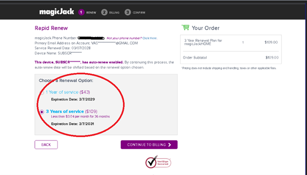 - Choose the renewal plan then click CONTINUE TO BILLING.NOTE: Review your phone number, primary email address and renewal date information!
